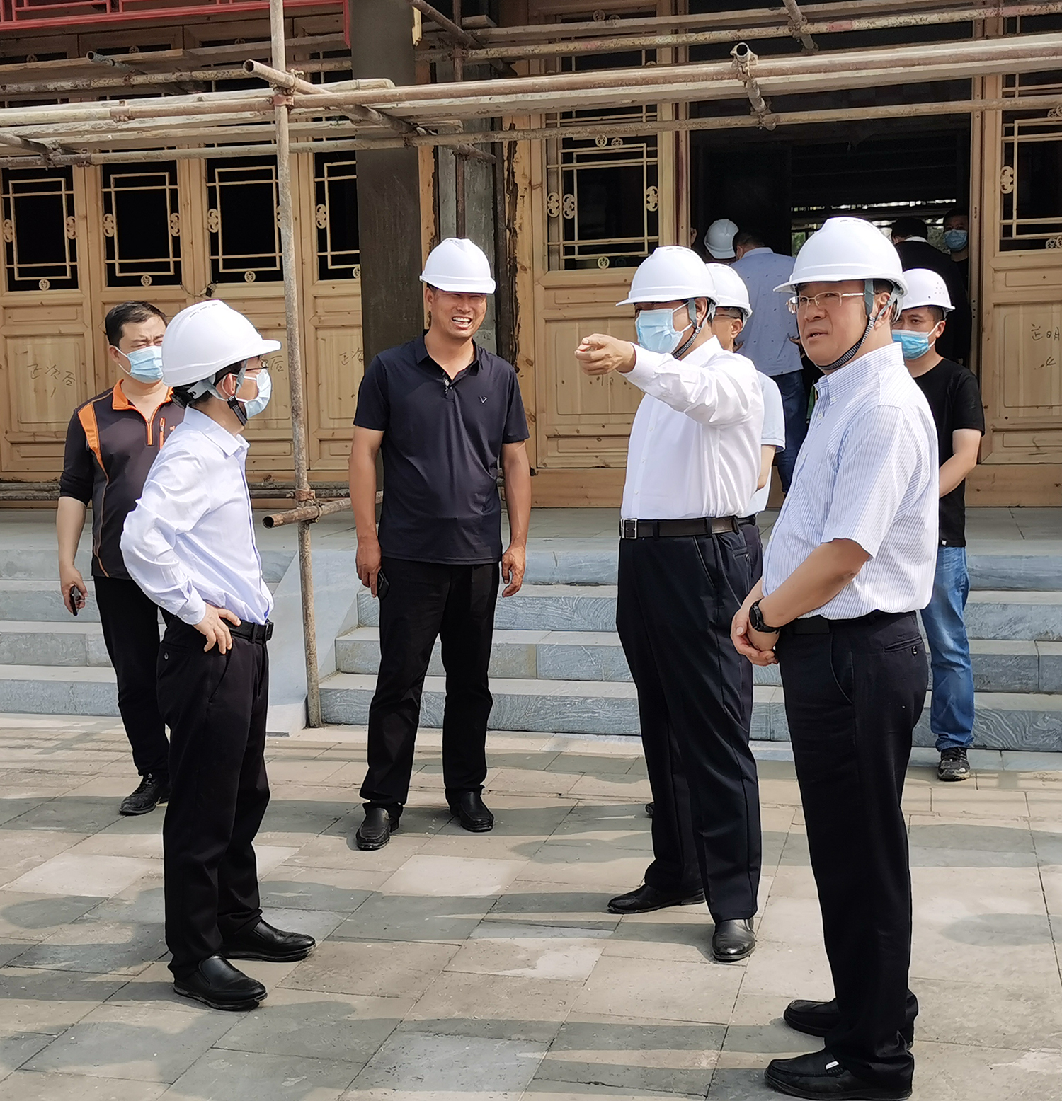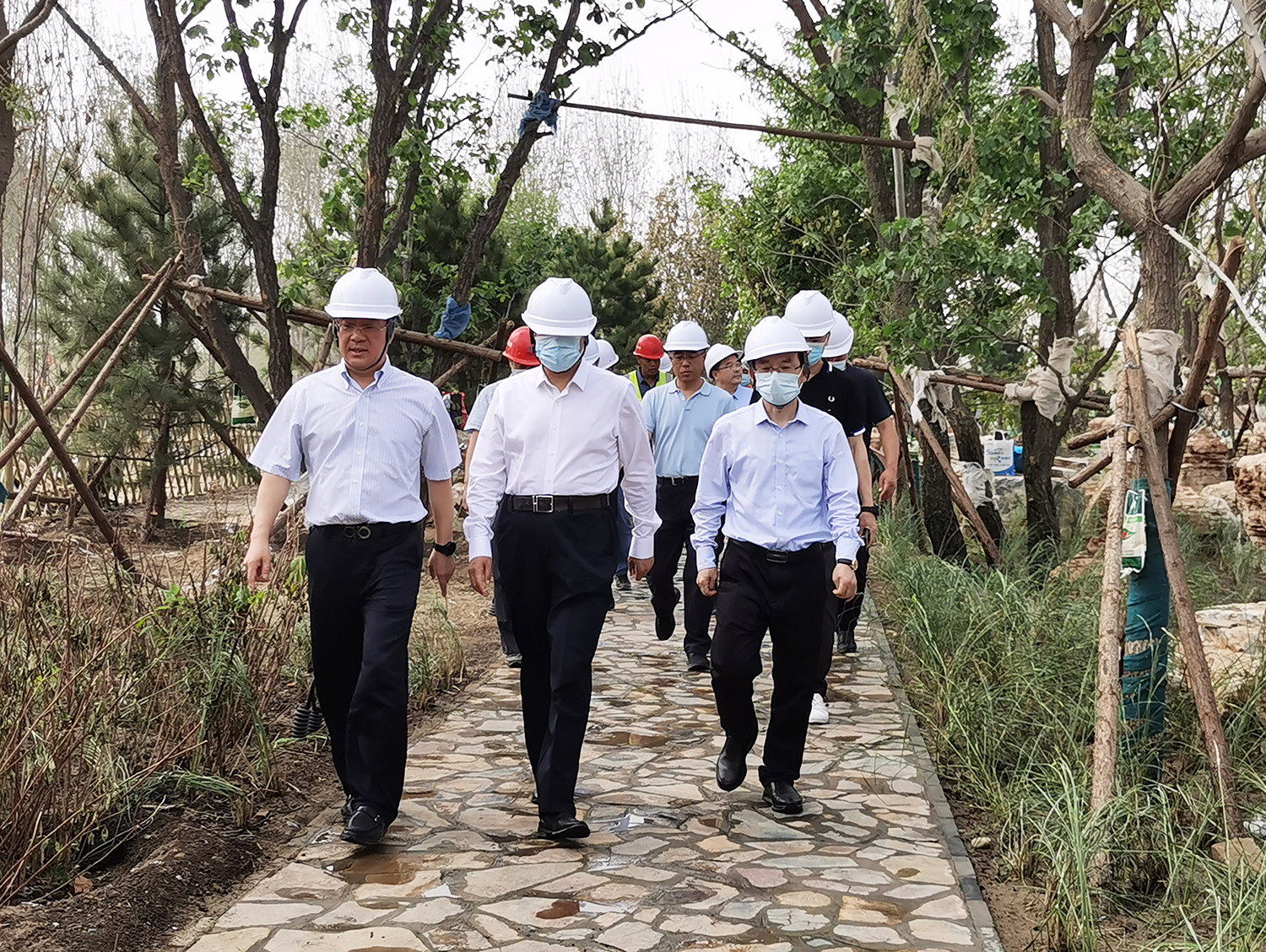 张建军董事长向吴清海书记汇报了雄安郊野公园承德园的规划设计、功能布局、工程建设等有关情况后,吴清海书记一行实地踏查了承德展园施工现场。