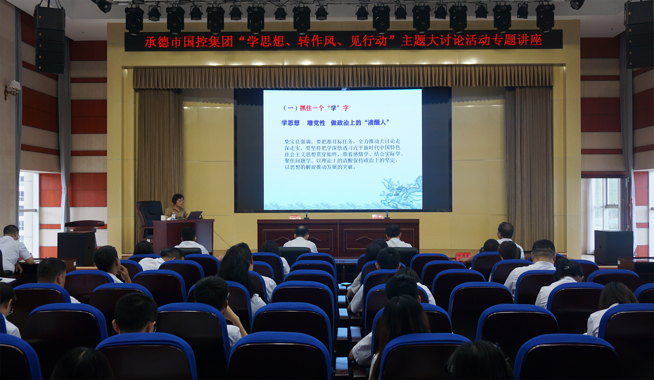 2023年7月6日,为深入学习贯彻习近平总书记关于坚持不懈抓好作风建设的重要论述,落实市委市政府关于在全市开展“学思想、转作风、见行动”主题大讨论活动精神,市满冠体育(中国)官方网站邀请承德市委党校党史党建教研室主任王仲娟教授,开展了“学思想、转作风、见行动”主题大讨论活动专题讲座,市满冠体育(中国)官方网站领导班子、集团本部全体员工、实际控制子公司中层以上负责同志及党员员工参加讲座。