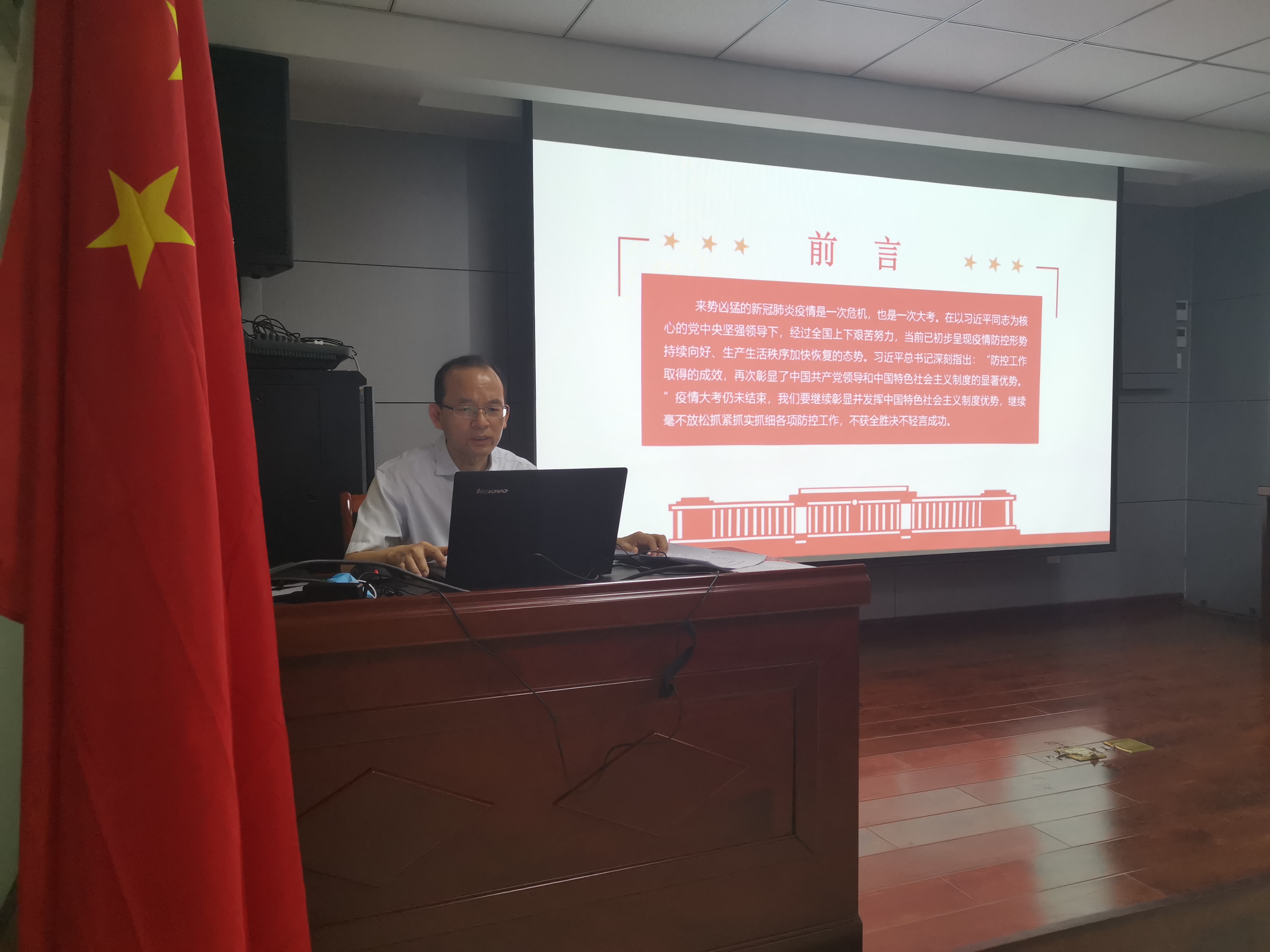 2020年7月2日上午,中共满冠体育(中国)官方网站第二支部委员会支部书记焦俊良同志以“在大考中彰显中国特色社会主义制度优势”为题,为全体支部党员和入党积极分子上了一堂别开生面的党课。